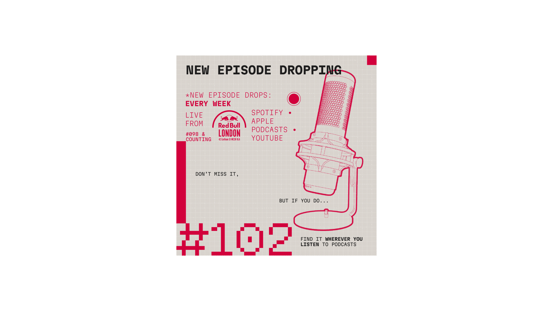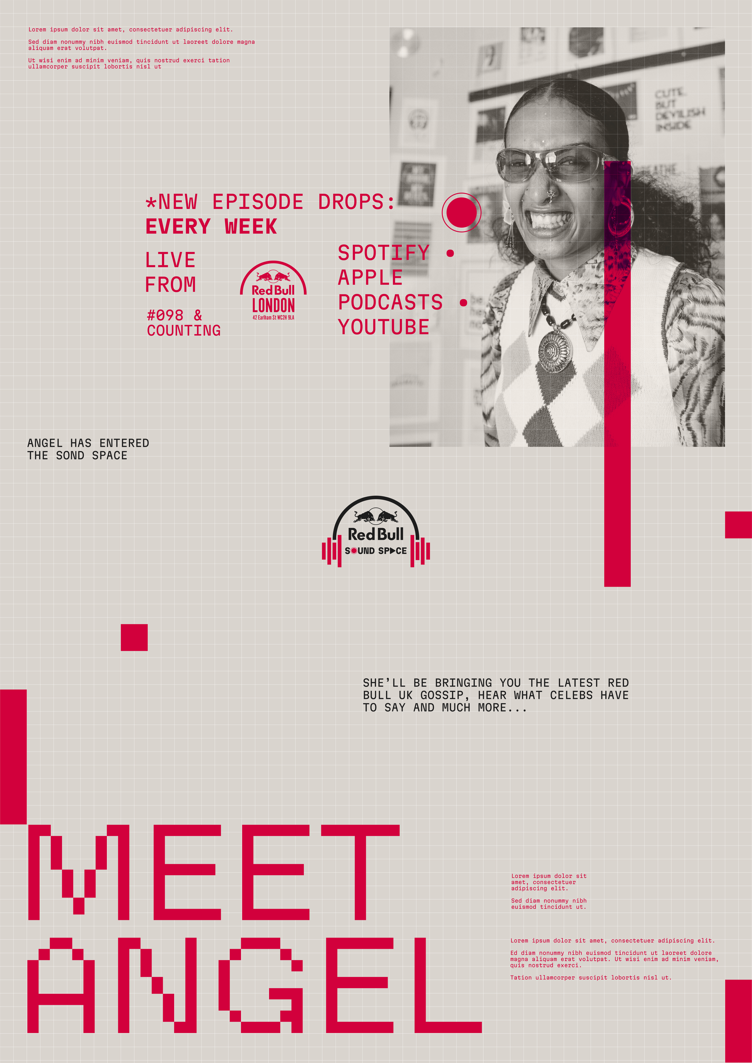 The crux of Red Bull Soundspace is simplicity. New designs want to be quick, and minimal, like the podcast format. A base grid sits in the back of all designs for the waveform blocks, imagery and type to snap to.